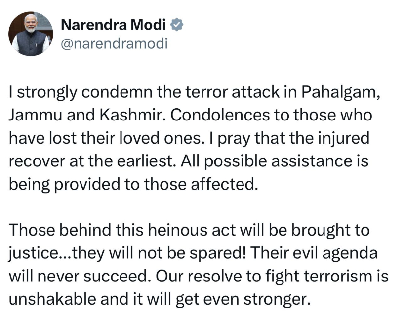 ഭീകരാക്രമണത്തിൽ പ്രധാനമന്ത്രി നരേന്ദ്ര മോദി അമർഷവും ദു:ഖവും രേഖപ്പെടുത്തി. അക്രമികളെ വെറുതെ വിടില്ലെന്ന് മോദി എക്സിൽ കുറിച്ചു.